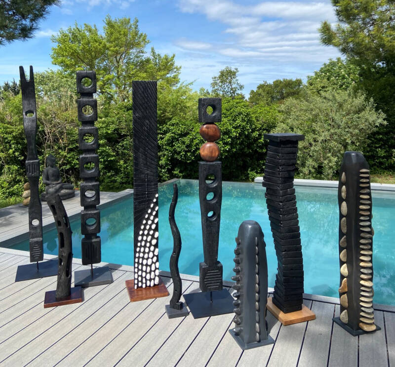 Jean-François est un « agenceur de pierres », rondes si possible (cailloux, galets, rochers), posées en solitaire ou disposées en chapelet ou en famille. Il est également un « brûleur de bois ». Par le feu il en calcine la surface ; le carbone anoblit le support et fascine par les craquelures de ses noirs profonds. Et quand il allie les deux, on voit s’hérisser de curieuses colonnes vertébrales et on surprend des parcours de Petit Poucet…